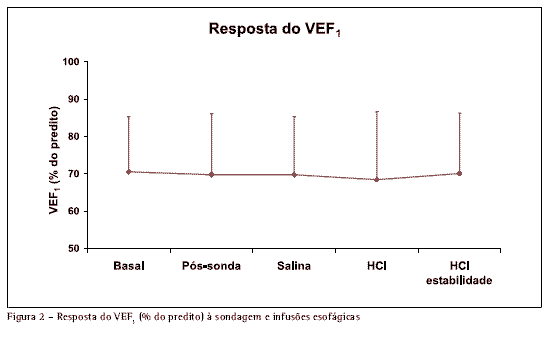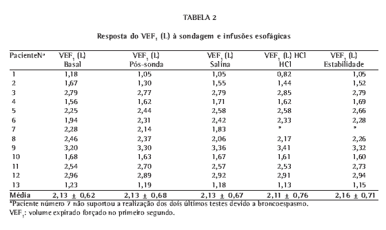 A função pulmonar apresentou-se estável durante os procedimentos de sondagem, infusão de solução salina, infusão de ácido clorídrico e manutenção da infusão ácida. Entretanto, 4 de 13 pacientes demonstraram reação brônquica a esses procedimentos: 2 deles à sondagem, 2 outros à infusão de solução salina e, destes 4, 2 reagiram com piora adicional durante a infusão ácida. O efeito da acidificação esofágica havia sido descrito em estudos prévios(7). Por outro lado, o efeito da sondagem ainda não havia sido investigado.