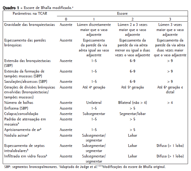 Outros autores,(3) ao avaliarem imagens de TCAR de tórax de crianças com FC através de cinco escores diferentes, demonstraram que todos os escores foram reprodutíveis, com CCI ≥ 0,74, e que os escores avaliados causavam uma maior variabilidade entre os observadores quando a pontuação era baixa, ou seja, em imagens tomográficas menos comprometidas. No presente estudo, evidenciou-se que a confiabilidade intraobservador para o escore de Bhalla modificado foi boa e se manteve estável tanto para escores totais baixos, quanto aqueles altos. O escore adotado se mostrou útil, mesmo em formas menos avançadas da doença.