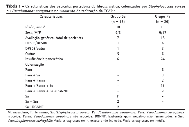 Os pacientes selecionados para inclusão no estudo foram separados em dois grupos, formados segundo o resultado dos exames microbiológicos das secreções respiratórias: grupo Sa, constituído por pacientes que apresentavam na secreção respiratória S. aureus, mas que nunca haviam sido colonizados por P. aeruginosa ou cujas culturas de secreção haviam sido negativas para P. aeruginosa nos últimos 12 meses; e grupo Pa, constituído por pacientes que preencheram critérios de colonização crônica por P. aeruginosa (mais de 50% das culturas positivas para P. aeruginosa) e que não apresentavam outras bactérias patogênicas nas secreções respiratórias há mais de 12 meses.