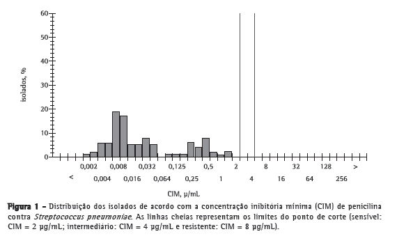 Todos os isolados analisados apresentaram CIM de penicilina ≤ 2 µg/mL, e a definição do ponto de corte para a resistência de isolados não relacionados a meningite agora é CIM ≥ 8 µg/mL. Os pontos de corte anteriores para CIM de penicilina para cepas de S. pneumoniae sensíveis, intermediárias e resistentes eram ≤ 0,06 µg/mL, 0,12-1,00 µg/mL e ≥ 2 µg/mL, respectivamente, porém apenas para aquelas oriundas de isolados relacionados a meningite.(8) Antes de 2008, mesmo um paciente infectado por uma cepa de S. pneumoniae resistente a penicilina poderia apresentar um bom desfecho clínico, devido às diferenças na farmacocinética da penicilina parenteral, e esse foi um dos principais motivos pelos quais o CLSI adotou novos pontos de corte em seus padrões, o que levou a melhores correlações clínicas e laboratoriais no que tange a infecções respiratórias. Mais importante, relatou-se que o uso dos novos pontos de corte para decidir quais pacientes beneficiar-se-iam do tratamento com penicilina não causou um aumento das taxas de letalidade. Os resultados obtidos com penicilina parenteral podem ser extrapolados para amoxicilina, ampicilina, cefalosporinas (de terceira e quarta geração) e ertapenem. Entretanto, os novos critérios não se aplicam à penicilina V (oral), já que esta apresenta parâmetros farmacocinéticos distintos, sendo considerados resistentes os isolados que apresentam CIM ≥ 0,06 µg/mL. No Brasil, durante a década de 1990, a prevalência de resistência na região sudeste do país era de menos de 5%; em 2003, a resistência de isolados pneumocócicos invasivos variava de 7,2% a 8,1%; no entanto, essas taxas estão relacionadas aos pontos de corte antigos.(9) Um estudo recente de vigilância no Brasil mostrou que, com os novos pontos de corte, a resistência a penicilina caiu de 33% para 1%, e apenas 1 isolado apresentou resistência intermediária à medicação.(10) Entretanto, naquele estudo, não obstante as baixíssimas taxas de resistência a penicilina, os isolados apresentaram taxas de resistência a cotrimoxazol, tetraciclina, eritromicina e clindamicina de 80%, 21%, 13% e 13%, respectivamente, ao passo que apenas 1 isolado apresentou resistência a ceftriaxona.(10)