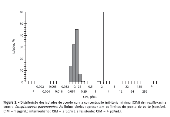 A aplicação dos pontos de corte para a sensibilidade de isolados não relacionados a meningite revelou que todos os isolados eram completamente sensíveis a penicilina parenteral (CIM ≤ 2 µg/mL), com CIM na qual 50% e 90% dos isolados são inibidos (CIM50 e CIM90) de 0,012 e 0,500 µg/mL, respectivamente (variação: 0,002-1,500 µg/mL). Das cepas de S. pneumoniae, 99% eram também sensíveis a moxifloxacina, e apenas uma cepa apresentou CIM de 1,5 µg/mL (intermediária), com CIM50 e CIM90 de 0,012 µg/mL (variação: 0,064-1,500 µg/mL; Tabela 1). As Figuras 1 e 2 resumem a distribuição dos isolados de acordo com a CIM para ambas as drogas.