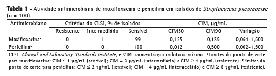 As taxas de resistência a penicilina em cepas de pneumococo vêm aumentando em vários países, especialmente na Ásia; essas taxas podem variar, e dados locais atualizados são necessários a fim de melhorar o manejo dessas infecções. É importante identificar a fonte da infecção a fim de melhorar a aplicação dos atuais pontos de corte para sensibilidade a penicilina.(3) Em um estudo conduzido em três países latino-americanos (Argentina, Brasil e México), detectou-se resistência global a penicilina em 15,3% dos isolados. A maior proporção de isolados completamente resistentes foi observada na Cidade do México (24,1%), e foi relativamente baixa na maioria dos centros no Brasil (8,1%).(4) Entretanto, em 2008, o Clinical Laboratory Standards Institute (CLSI) atualizou os pontos de corte para a sensibilidade de S. pneumoniae a penicilina com novas definições de categorias de acordo com a fonte clínica dos isolados (relacionados a meningite e não relacionados a meningite), com base em evidências farmacocinéticas e farmacodinâmicas. Em estudos recentes no Brasil,(5) nenhuma das cepas avaliadas revelou-se resistente a penicilina, isto é, com concentração inibitória mínima (CIM) ≥ 8 µg/mL, quando foram aplicados os padrões atualizados do CLSI.(6) As taxas de resistência de S. pneumoniae a fluoroquinolonas respiratórias, embora em geral muito baixas (< 1%), também surgiram em alguns países (como o Canadá, por exemplo) e, portanto, devem ser submetidas a atento monitoramento local.(5,7) O objetivo do presente estudo foi determinar a CIM de penicilina e moxifloxacina contra cepas de S. pneumoniae isoladas em um hospital terciário.