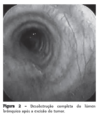 Nos casos aqui apresentados, as lesões foram removidas por ressecção via broncoscopia, eletrocautério e alça de polipectomia. Em um caso, três sessões foram necessárias para completar a ressecção. Os outros três pacientes foram tratados em uma única sessão. Uma paciente apresentou broncoespasmo após o procedimento, o qual foi resolvido em 24 h através de medidas clínicas.