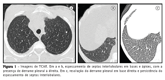 A doença de Niemann-Pick (DNP) é uma afecção de depósito lisossomal rara, generalizada e grave, caracterizada por deposição intracelular de esfingomielina por insuficiência na produção da enzima esfingomielinase.(1) Do ponto de vista respiratório, os vários tipos de DNP, incluindo o tipo B, podem apresentar acometimento pulmonar com progressiva perda da função pulmonar e achado radiológico sugestivo. Relatamos o caso de uma paciente do sexo feminino, 27 anos, com DNP tipo B. Foi inicialmente encaminhada para acompanhamento ambulatorial em 2003, com história de hepatoesplenomegalia e retardo no desenvolvimento neuropsicomotor desde a infância. A DNP foi confirmada por dosagem de esfingomielinase em leucócitos periféricos, a qual estava diminuída (0,009 nmol  h−1  mg−1 de proteína; valor de referência: 0,745 nmol  h−1  mg−1 de proteína). Sorologias para HIV, venereal disease research laboratory e hepatite B e C foram negativas, e FAN foi não reagente. A doença de Gaucher foi afastada por dosagem normal de beta-glicosidase. A paciente evoluiu com ascite e queixa de dispneia leve, sendo encaminhada para o serviço de pneumologia. Foi submetida a um teste de caminhada de seis minutos (TC6; distância percorrida = 396 m; distância prevista = 724 m), com dispneia intensa ao final do exame (escore da escala de Borg modificada = 9), mas sem dessaturação de oxigênio (SpO2 = 97%); a espirometria revelou-se sugestiva de distúrbio ventilatório restritivo [VEF1 = 1,77 L (61% do previsto); CVF = 2,07 L (57% do previsto); relação VEF1/CVF = 85%]. A radiografia de tórax não evidenciou alterações pulmonares. A TCAR revelou espessamento de septos interlobulares em bases e ápices, com a presença de derrame pleural à direita (Figuras 1a e 1b).