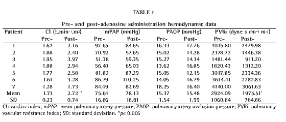 After adenosine administration, there was a significant increase in the cardiac index, as well as a significant reduction in the pulmonary vascular resistance index. Mean pulmonary artery pressure, pulmonary artery occlusion pressure and PCP were not significantly altered. The artR / (artR + venR) relationship followed the same pattern.