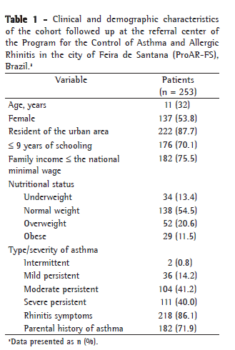 Data regarding nutritional status (body mass index)(15); data regarding asthma history (age at first attack, severity of the disease and frequency of ER visits in the 12 months before and after admission to the outpatient clinic); data regarding medical care (use of prophylactic medication, number of follow-up visits during monitoring and respiratory therapy); and data regarding overall health status (including comorbidities, such as allergic rhinitis, arterial hypertension and diabetes). The classification of the patients as children, adolescents or adults was in accordance with the criteria of the World Health Organization.(15)