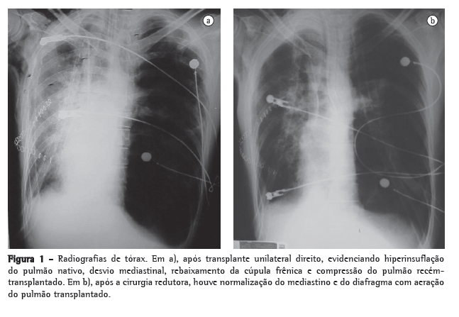 Após 7 meses em lista de espera, foi submetido a transplante pulmonar unilateral direito, com tempo de isquemia de 210 min. A imunossupressão foi realizada com azatioprina, ciclosporina e solumedrol. O paciente foi encaminhado para a UTI, permanecendo intubado por 5 dias. Porém, evoluiu com insuficiência respiratória, necessitando reintubação. Progressivamente, notou-se hiperinsuflação do pulmão nativo, com desvio do mediastino e piora do padrão ventilatório. Optou-se pela ventilação independente, mas não houve melhora radiológica ou clínica (Figura 1).