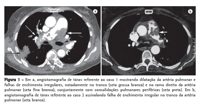 Os exames laboratoriais não demonstravam alterações significantes, exceto por dosagens de peptídeo natriurético tipo B e de proteína C reativa elevadas. As pesquisas para trombofilia foram negativas. Uma nova angiotomografia de tórax realizada durante a internação evidenciava as mesmas alterações vasculares; entretanto, com aparecimento de consolidações pulmonares periféricas e padrão de perfusão em mosaico (Figura 1a). O ecocardiograma demonstrava pressão sistólica em artéria pulmonar estimada em 75 mmHg (valor de referência < 30 mmHg).
