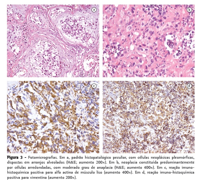A biópsia do ramo pulmonar descendente anterior direito demonstrou a presença de neoplasia maligna de padrão sólido, constituída de células atípicas pleomórficas com intensa atividade mitótica e anaplasia nuclear, em grande parte de formato arredondado, tendendo à agregação de aspecto peculiarmente "alveolado". O perfil imuno-histoquímico mostrou positividade para alfa actina de músculo liso e para vimentina, sendo negativas as reações para CD31, CD34, CD45, citoqueratinas AE1/AE3, desmina, proteína S-100 e fator de transcrição tireoidiano 1, confirmando-se o diagnóstico de leiomiossarcoma pleomórfico de artéria pulmonar (Figura 3).