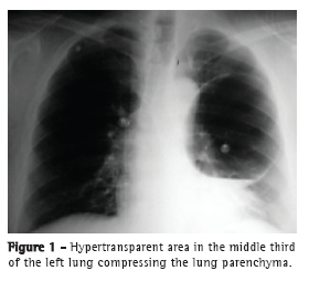 Surgical treatment of lung bullae is indicated for patients who present with complications, such as rupture, pneumothorax, bleeding, and infection. In cases of uncomplicated lung bullae, resection is reserved for asymptomatic patients, for bullae occupying more than 30% of the hemithorax, and for progressively growing bullae.(6) Video-assisted thoracoscopic resection of lung bullae, when appropriate, is safe and effective.(7) One alternative that is less invasive and avoids complications related to general anesthesia is simple chest tube drainage under local anesthesia.(8) Regardless of the technique employed, surgical resection remains the treatment of choice for congenital cystic malformations of the lung and pulmonary lesions in which the radiological findings are inconclusive; the procedure allows us to conduct a histological study and prevent infections or neoplastic transformation.(9) In the case reported here, the patient presented with sudden-onset chest pain and dyspnea due to expansion of a lung bulla located in the upper lobe of the left lung, as confirmed by chest X-rays. According to the patient, previous imaging tests had shown the bulla to be smaller than we found it to be. Our choice of treatment was resection of the lung bulla by thoracotomy and mechanical stapling associated with abrasion pleurodesis.