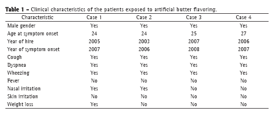 Objective: To report the cases of four patients with bronchiolitis caused by exposure to artificial butter flavoring at a cookie factory in Brazil. Methods: We described the clinical, tomographic, and spirometric findings in the four patients, as well as the lung biopsy findings in one of the patients. Results: All four patients were young male nonsmokers and developed persistent airflow obstruction (reduced FEV1/FVC ratio and FEV1 at 25-44% of predicted) after 1-3 years of exposure to diacetyl, without the use of personal protective equipment, at a cookie factory. The HRCT findings were indicative of bronchiolitis. In one patient, the surgical lung biopsy revealed bronchiolitis obliterans accompanied by giant cells. Conclusions: Bronchiolitis resulting from exposure to artificial flavoring agents should be included in the differential diagnosis of airflow obstruction in workers in Brazil.