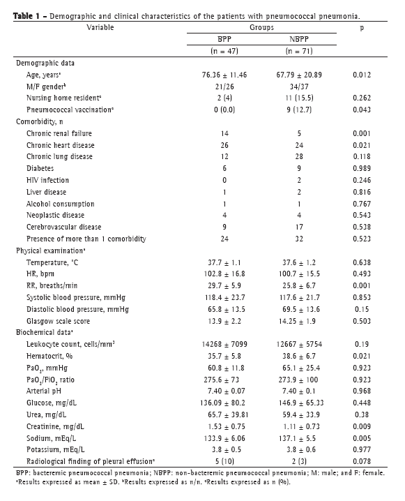 Over a 4-year period, 798 patients diagnosed with CAP were hospitalized. Of those, 158 were excluded from the analysis because they did not meet all of the inclusion criteria or because they met one of the exclusion criteria. Of the remaining 640 patients, S. pneumoniae was found to be the etiologic agent in 118, who were therefore selected for inclusion in the study. Forty-seven met the criteria for BPP, and 71 met the criteria for NBPP. There were 23 outpatients. Of those, 5 were found to have bacteremia due to S. pneumoniae.
