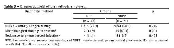 In the present study, we found certain differences between the characteristics of BPP and those of NBPP. We found that BPP was more common in older individuals than was NBPP, a finding that is in disagreement with those of previous studies.(15,16) We were unable to compare the incidence of BPP and NBPP in HIV-positive patients and intravenous drugs users with the incidence of BPP and NBPP in patients who did not have those characteristics because the incidence of HIV infection and intravenous drug use in our hospital population was zero. One third of our population had been diagnosed with COPD, a comorbidity that tended to be more common in NBPP patients (p = not significant). We found a predominance of BPP in patients with chronic heart disease or chronic renal failure, as has been reported, especially in elderly individuals who present with neutrophil dysfunction, decreased production of immunoglobulins, and malnutrition.(17)