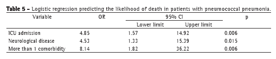Logistic regression was performed to evaluate the impact of a number of variables on mortality in patients with pneumococcal pneumonia. As shown in Table 5, only three of the variables considered were found to be independently and significantly related to mortality in those patients: presence of more than one comorbidity (OR: 8.14); ICU admission (OR: 4.85); and presence of neurological disease (OR: 4.53).