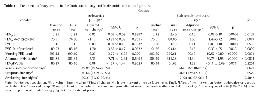 Regarding the primary outcome measures, the 12-week treatment resulted in statistically significant mean increases in FEV1 and morning PEF-of 104 mL (95% CI: 22-186 mL) and 23.93 L/min (95% CI: 10.89-36.93 L/min), respectively-in the BF group as compared with the budesonide-only group. These results represent an estimate of the difference in change (final value - baseline value) in FEV1 in the comparison of the two groups, calculated by the following formula: