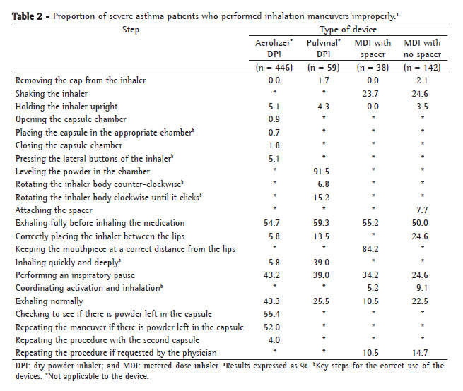 In the present study, we evaluated the inhaler maneuvers performed by patients with severe asthma enrolled in an asthma control program. In general, the patients performed well when using MDIs and DPIs, suggesting that they had learned how to use them. This learning might be related to the high rate of treatment compliance (> 80%), which has been reported in another study involving ProAR patients.(15)