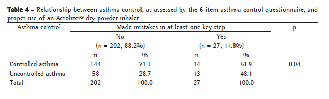 Correct performance of the key steps involved in using the devices was one of the factors affecting asthma symptom control. These steps are related to placing the capsule in the correct position, piercing it for the subsequent drug release, and inhaling quickly and deeply. Inhaling quickly and deeply is crucial for fully delivering the drug to the lung, and, in the present study, this key step was the one with the highest proportion of errors. This might have contributed to the lack of asthma control among those who did not take a quick and deep inhalation correctly, which corroborates the findings of another group of authors,(18) who reported that slow inhalation is one of the reasons for partial distribution of the drug in the lung. There were no significant differences regarding clinical or sociodemographic characteristics between the subgroups of patients who made use of an Aerolizer® DPI alone. However, we observed that the patients with severe asthma who made mistakes in key steps had a lower level of education and were over 45 years of age. Similar results were reported in another study, in which the error rate in using DPIs was found to be higher among patients who were older and had a low level of education.(17)