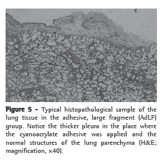 Cyanoacrylates have been extensively used as surgical tissue adhesives,(2-5) and they have been shown to be safe.(6-8) Their use as a surgical adhesive has been recommended due to their characteristics: fast polymerization after application and contact with fluids, such as water and blood, or with moist tissues. However, in order to obtain better gluing results, cyanoacrylate adhesives should be applied to surfaces that are as dry as possible.(6) The first cyanoacrylates developed for surgical procedures were short-chain adhesives, and this kind of adhesive was extensively studied and consequentially rejected for surgical use because of the intense local inflammation and foreign body reactions that they caused.(8) That type of cyanoacrylate adhesive is rapidly degraded, producing toxic substances, such as cyanide gas and formaldehyde.(8-10) Long-chain cyanoacrylate adhesives, however, have been shown to be secure, because the degradation process is slower, producing a lower quantity of toxic substances. Ethyl 2-cyanoacrylate adhesive is one of the long-chain cyanoacrylate adhesives. However, even long-chain cyanoacrylate adhesives should be used with caution, because they can be toxic, depending on the amount of adhesive used and on the degree of vascularization of the tissue involved. Tissues that are richly vascularized can develop mild, moderate, or severe inflammatory reactions. The use of small amounts of cyanoacrylate adhesives has not been implicated in intoxication, even when applied to richly vascularized tissues.(10) Cyanoacrylate adhesives have been experimentally and clinically used as topical hemostatic agents in parenchymal tissues, as well as in oral surgery, incisions, and skin grafts.(4,5,11). Therefore, the use of ethyl 2-cyanoacrylate tissue adhesive might be an alternative method to repair the lung parenchyma after partial lobectomy.