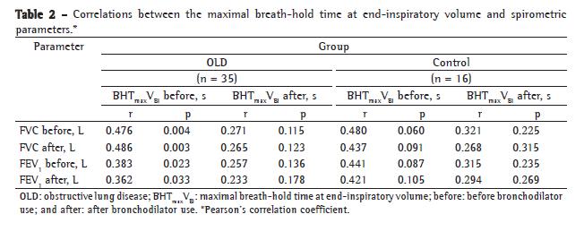 In conclusion, we found that pre- and post-bronchodilator BHTmaxVEI and BHTmaxVEE values were lower in the OLD group than in the control group However, after bronchodilator use, only BHTmaxVEE values were significantly lower in the OLD group. The breath-hold test can aid in recognizing severe pulmonary changes, as well as in promoting a more effective behavioral intervention. Post-bronchodilator BHTmaxVEI and BHTmaxVEE values should be interpreted with caution, given that they can be significantly different from pre-bronchodilator values. Further studies are needed in order to confirm the usefulness of the breath-hold test and the effect of bronchodilator use, particularly as a screening tool for the evaluation of dyspnea.