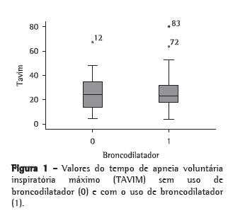 Em nosso estudo, o TAVEM foi diferente entre casos e controles tanto antes quanto após o uso de broncodilatador. Além disso, houve uma melhora importante nos valores com o uso do broncodilatador. Apesar de um estudo anterior ter sugerido que o teste de apneia não seria útil como um teste de função pulmonar,(19) vários estudos mostraram que o teste de apneia pode desempenhar um papel na avaliação da dispneia e que o uso do broncodilatador melhora os valores do TAVEM.(8-10,20-22)