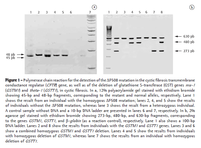 Genomic DNA of peripheral blood was used for the genotyping of all CF patients. The F508 CFTR mutation was detected directly by polymerase chain reaction (PCR; Figure 1a).(19) The G542X, G551D, R553X, R1162X, W1282X, and N1303K mutations of the CFTR gene were analyzed by restriction endonuclease digestion of the PCR products.(20) The genes GSTM1, GSTT1 and -globin (as a reaction control) were amplified by multiplex-PCR (Figure 1b).(21)