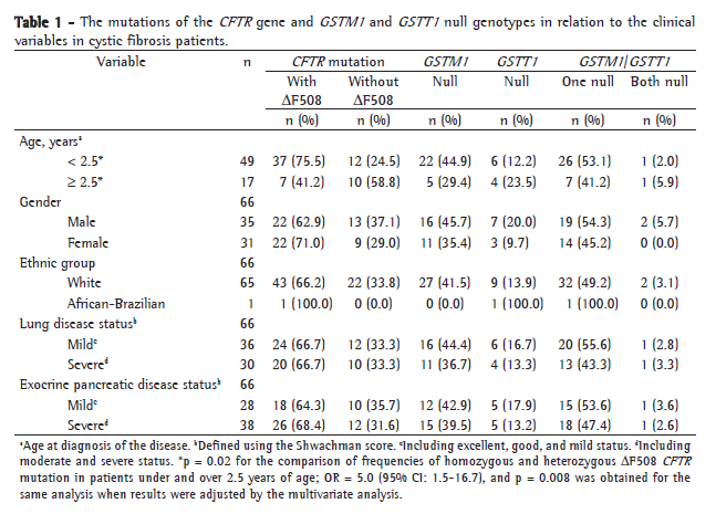 DiscussionThe distribution of the patients enrolled in the study by age at diagnosis, gender, ethnic origin, and severity of lung/exocrine pancreatic disease status showed that our CF patients were similar to those in other countries.(1) The F508 CFTR gene mutation was the most common mutation found in our study, which corroborates other reports from the same region of Brazil,(16,22-25) as well as international reports.(26,27) Other mutations of the CFTR gene, such as R1162X and N1303K, were less common in our CF patients,(22,24,28) as has been reported for CF patients in other parts of the world.(27) The frequencies of the GSTM1 and GSTT1 null genotypes in the CF patients in our study were similar to those found in healthy individuals, in Brazil(29) and elsewhere.(15) Therefore, our sample seems to be representative of CF patients throughout the world.