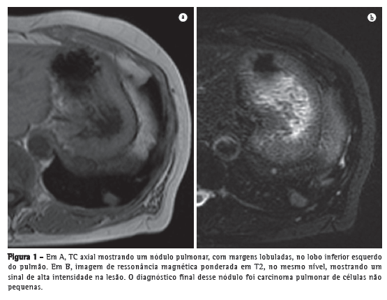 A avaliação precisa de linfonodos mediastinais é essencial para a seleção do plano de tratamento apropriado para pacientes com carcinoma pulmonar de células não pequenas (CPCNP). A Figura 3 mostra imagens de TC e RM de um linfonodo suspeito. Ohno et al.(7) conduziram um estudo prospectivo de 115 pacientes consecutivos com CPCNP submetidos a TC, RM em sequência short-tau inversion-recovery turbo spin-echo (STIR-TSE) e FDG-PET/TC, bem como a exame cirúrgico e anatomopatológico. Os autores constataram que, por paciente, a sensibilidade quantitativa e a precisão quantitativa da RM em sequência STIR-TSE (90,1% e 92,2%, respectivamente) foram significativamente maiores que a sensibilidade quantitativa, a sensibilidade qualitativa, a precisão quantitativa e a precisão qualitativa de imagens obtidas por FDG-PET/TC (76,7%, 74,4%, 83,5% e 82,6%, respectivamente).