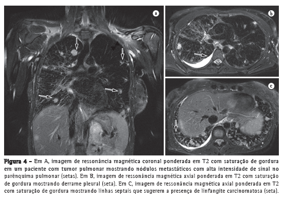 Por ser mais eficaz que os métodos convencionais de estadiamento para determinar o estágio TNM, a combinação PET/TC parece ser uma ferramenta de primeira linha para o estadiamento do câncer de pulmão. Entretanto, a RM tem assumido um papel cada vez mais importante nesse cenário. A Figura 4 mostra a habilidade da RM para demonstrar, de forma clara, metástases locais de um tumor pulmonar. Relatou-se que a combinação PET/TC não é capaz de revelar metástases microscópicas em aproximadamente 20% dos pacientes submetidos a tratamento cirúrgico.(12) Estudos anteriores demonstraram que a RM de corpo inteiro tem precisão aceitável e que sua eficácia no estadiamento do câncer de pulmão é comparável àquela da combinação PET/TC.(13) Cada uma dessas duas modalidades de imagem tem suas vantagens(12); a RM de corpo inteiro é melhor para detectar metástase cerebral e hepática, ao passo que a combinação PET/TC é melhor para detectar metástase em linfonodos e tecidos moles. Para a avaliação de áreas submetidas a radioterapia, a difusão é uma técnica promissora.(12) A RM de corpo inteiro com imagem ponderada em difusão pode ser utilizada para a avaliação do estágio M (metástase) em pacientes com CPCNP e revelou-se tão acurada quanto a combinação PET/TC.(14)