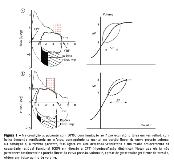 O desenvolvimento de hiperinsuflação dinâmica (HD) durante o exercício é bastante prevalente em pacientes com DPOC moderada a grave, chegando a 80-85%,(1,2) mas também ocorre naqueles com acometimento leve.(5) A HD é resultado de uma limitação ao fluxo expiratório frente a um tempo expiratório reduzido ao esforço, em função do aumento da demanda ventilatória. Nos pacientes com limitação de fluxo expiratório mesmo ao repouso, a HD, refletida pelo deslocamento da capacidade residual funcional (CRF) em direção à CPT, é a única estratégia que possibilita um ganho de fluxo na expiração e, portanto, um aumento no volume corrente (Figura 1a). A força muscular inspiratória gerada ainda determina uma boa resposta no aumento de volume (porção linear da curva pressão-volume, Figura 1a). Com isso, em baixas demandas de ventilação (esforços leves a moderados), essa estratégia é bem tolerada. Entretanto, para ventilações mais altas (esforços moderados a intensos), a CRF desloca-se ainda mais em direção à CPT, e a força inspiratória não é capaz de gerar um ganho proporcional de volume (dissociação neuromecânica), pois está em uma porção menos complacente do sistema respiratório (Figura 1b). Como consequência clínica, a dispneia aumenta acentuadamente, e o paciente interrompe o esforço. Além da sobrecarga ventilatória, a HD pode determinar efeitos adversos sobre a musculatura inspiratória e o sistema cardiovascular, inclusive com possibilidade de redução do débito cardíaco.(1,3)