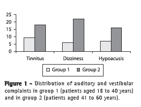 Although the objectives of this study did not include determining the causal factor of the hearing impairment, we performed a statistical analysis to investigate a potential association between the variables of interest (smoking, alcohol consumption, ototoxic medication use, gender, and exposure to noise) and the audiometric findings. The patients were divided into two groups: patients aged 18 to 40 years (group 1) and patients aged 41 to 60 years (group 2). The evaluation was performed using two age groups to prevent age from being a confounding factor, since the auditory losses resulting from advancing age affect most of the population and show the same audiometric tracing as that of the variables studied.(3)
