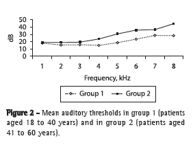 Abnormal audiometric findings (irreversible hearing loss) were more common in group 2 than in group 1, being observed in 30 (69.7%) and 24 (44.4%) of the 43 and 54 patients, respectively (p = 0.02; OR = 2.8; 95% CI: 1.15-7.35). The auditory abnormalities were of varying degrees, ranging from mild to severe loss, and a common characteristic to all of the results was worse auditory thresholds at high frequencies (Figure 2).
