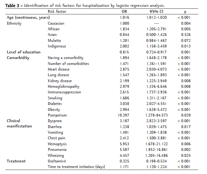 Level of education and use of oseltamivir were found to be protective factors against hospitalization, reducing the OR for the occurrence of this outcome. The remaining variables were classified as risk factors for hospitalization.