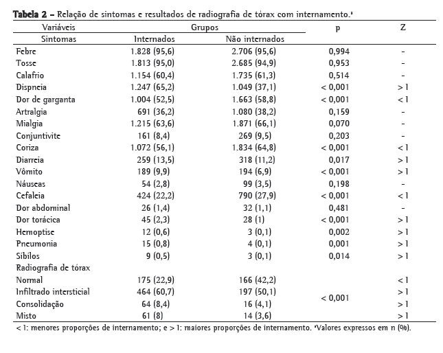 Buscou-se também avaliar a relação das manifestações clínicas da doença como fator de risco para o internamento, cujos resultados estão representados na Tabela 2.