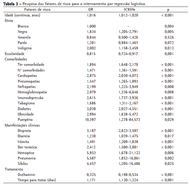 Os fatores de risco para o internamento foram idade, presença de algumas comorbidades (cardiopatias, pneumopatias, nefropatias, hemoglobinopatia, imunodepressão, diabetes, obesidade, puerpério e tabagismo), número de comorbidades associadas, presença de alguns sintomas (dispneia, vômito, dor torácica, hemoptise e sibilos) e de algumas manifestações clínicas (diarreia e pneumonia). Níveis maiores de escolaridade e uso precoce do oseltamivir foram relacionados a fatores de proteção. A hospitalização dos pacientes contribuiu para o aumento da sobrevida, e a vacinação contra a influenza pareceu diminuir a gravidade clínica da infecção por essa cepa pandêmica, refletindo em menores taxas de internamento e de óbito.