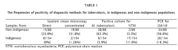Currently, among the new laboratory methods for TB diagnosis, the polymerase chain reaction (PCR) method stands out. This technique provides results in a period of time similar to that of sputum smear microscopy, using a mycobacteria concentration similar to that used for culture, and PCR is able to define the etiologic agent. (3-4) In light of this, the objective of the present study was to evaluate PCR with oligonucleotides for the insertion sequence 6110 (IS6110) of the Mycobacterium tuberculosis complex in testing sputum samples from indigenous patients (Yanomamis from the Cauaburis River region) and non-indigenous patients (residing in the city of Manaus, located in the state of Amazonas). All of the patients experienced respiratory symptoms and were suspected of having pulmonary TB.