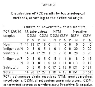 As a consequence of the greater incidence of NTM in the samples of indigenous patients, the concordance between the PCR results and the M. tuberculosis-positive culture was significantly inferior (0.25) to that obtained in the samples of non-indigenous patients (0.79). Consequently, for the analysis to represent an irrefutable finding, it would have to be aggregated to an analysis of clinical evolution and radiologic findings, in order to rule out, or not, the presence of active TB.