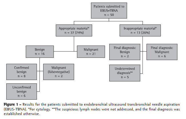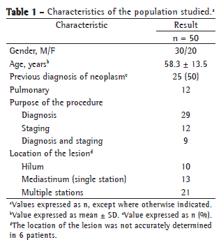 In the present study, we included 50 patients submitted to EBUS-TBNA. The characteristics of the population studied are described in Table 1.