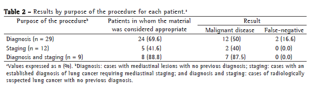 To determine the optimal number of aspirations per lymph node needed to obtain a higher diagnostic yield, one group of authors reported having performed four aspirations on each of the 163 lymph nodes studied in 102 patients with lung cancer. Those authors obtained 90.1% of appropriate samples in the first aspiration, reaching 100% in the third aspiration. Their conclusion was that maximum diagnostic values were achieved in three aspirations.(12) In the present study, we performed 2.5 punctures/biopsies per lymph node. Our impression is that, in the learning curve, the number of punctures/biopsies per lymph node should have been higher in order to increase the diagnostic yield of the method. The technical difficulty in accessing the lymph nodes, which was a result of our learning curve, explains the fact that, in some situations, fewer than 3 aspirations were performed.