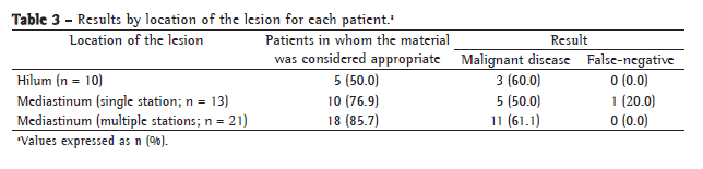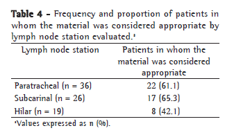 Even experienced centers show relatively high rates of inappropriate samples. One group of authors reported that, of 131 cases of mediastinal lymph node sampling performed at the Johns Hopkins Hospital, 7 (5.3%) had samples that were considered inappropriate.(9) In the present study, the rate of inappropriate samples was 25%, which is similar to the rates reported in the literature for initial experiences. Contributing to that is the fact that the biopsies involved hilar lymph node stations, which had a higher rate of "inappropriate" samples when compared with the biopsies involving the subcarinal station, which is more easily accessed.