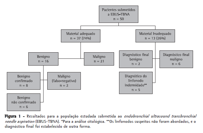 Objetivo: Endobronchial ultrasound-guided transbronchial needle aspiration (EBUS-TBNA, punção aspirativa por agulha guiada por ultrassom endobrônquico) é um método novo em diagnóstico e estadiamento linfonodal mediastinal. O objetivo do estudo foi avaliar os resultados preliminares obtidos com EBUS-TBNA no diagnóstico de lesões e no estadiamento linfonodal mediastinal. Métodos: Foram avaliados pacientes com tumores ou adenopatias mediastinais e com diagnóstico ou suspeita de câncer de pulmão. Os procedimentos foram realizados com os pacientes sob sedação ou anestesia geral. O material coletado foi preparado em lâminas fixadas em álcool absoluto para citologia e em formol para bloco de células. Resultados: Foram incluídos 50 pacientes (30 do sexo masculino), com média de idade de 58,3 ± 13,5 anos. Foram realizadas 201 punções em 81 linfonodos ou massas mediastinais (média de 2,5 punções). O material obtido foi considerado adequado para análise citológica em 37 pacientes (74%), dos quais 21 (57%) foram diagnosticados com malignidade. Nos 16 pacientes remanescentes, 1 teve diagnóstico de tuberculose, 6 tiveram seguimento clínico, e 9 foram submetidos a investigação adicional (2 diagnosticados com neoplasia - resultados falso-negativos). O rendimento do exame foi maior nos procedimentos com objetivo diagnóstico, em pacientes com lesões em múltiplas estações, e nas punções da estação linfonodal subcarinal. Um paciente apresentou sangramento endobrônquico resolvido com medidas locais. Não houve mortalidade na série. Conclusões: Esta experiência preliminar confirmou que o EBUS-TBNA é procedimento seguro, e que o nosso rendimento diagnóstico, inferior ao da literatura, foi compatível com a curva de aprendizado do método.
