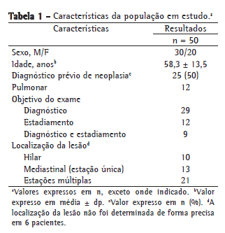No presente estudo, foram incluídos 50 pacientes submetidos a EBUS-TBNA. As características da população estudada estão descritas na Tabela 1.