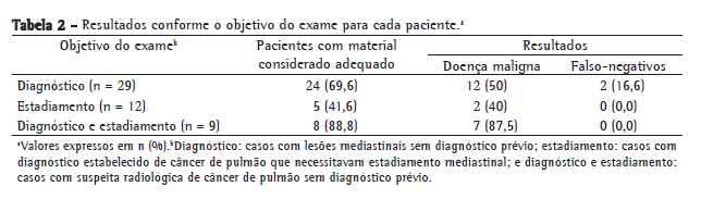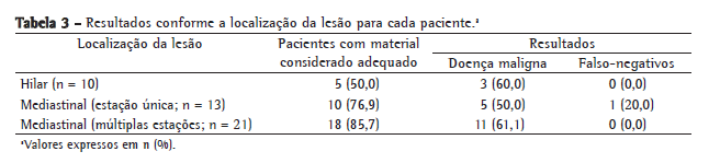 As Tabelas 2 e 3 demonstram, conforme o objetivo do procedimento e a localização da lesão suspeita, a proporção de casos cujas amostras continham material adequado para análise. O rendimento do exame pareceu maior nos procedimentos para diagnóstico se comparados aos que foram realizados para estadiamento de câncer. O rendimento também foi maior nos pacientes que tinham lesões múltiplas. Corroborando essa hipótese, todos os 7 pacientes que apresentavam doença mediastinal em múltiplas estações e suspeita radiológica para câncer de pulmão, os quais foram submetidos ao exame para diagnóstico e concomitante estadiamento, tiveram o diagnóstico definitivo estabelecido pelo EBUS-TBNA. Por outro lado, apenas 1 paciente com diagnóstico de câncer de ovário e lesão hilar suspeita foi submetida ao EBUS-TBNA com intenção de estadiamento, e, nessa paciente, a amostra foi considerada inadequada para a análise citológica.