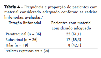 Mesmo serviços experientes apresentam índices relativamente altos de amostras inadequadas. Um grupo de autores relatou que, de 131 casos de punção linfonodal mediastinal realizadas no Johns Hopkins Hospital, 7 (5,3%) foram consideradas não adequadas.(9) Em nossa casuística, as amostras inadequadas foram 25%, o que não foi diferente do relatado na literatura a respeito de experiências iniciais. Contribuiu para isso o fato de terem sido puncionadas estações linfonodais hilares, que apresentaram um maior índice de amostras "não adequadas" em relação às punções realizadas na estação subcarinal, que é mais facilmente acessada.