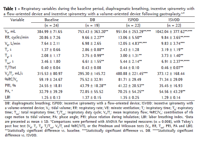 The purpose of this study was to evaluate breathing pattern and thoracoabdominal motion in obese patients following gastroplasty during breathing at rest, DB, IS with a flow-oriented device (ISFOD) and IS with a volume-oriented device (ISVOD), considering the physiological basis of these techniques.