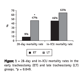 Our findings show the benefits of performing tracheostomy early in individuals with neurological disease and severely impaired consciousness. The 28-day mortality rate was lower in the ET group than in the LT group (9% vs. 47%; p = 0.049). There was no statistically significant difference between the groups regarding mortality by the end of the ICU stay, although the rate was lower among the ET group patients (46% vs. 65%; p = 0.44). The small size of our sample might have contributed to the lack of a significant difference. In addition, the patients presented with extremely severe clinical and neurological conditions, as evidenced by the high APACHE II and SOFA scores and the low GCS scores, which limits the impact of any specific therapeutic measure. These are patients who often develop severe sequelae, which leave them exposed to complications while still in the hospital, and those complications can lead to death.