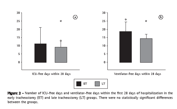 Two additional findings (fewer cases of VAP within the first 7 days of MV and a greater number of ventilator-free days within the first 28 days of hospitalization) suggest that early tracheostomy provides benefits, although the differences were not statistically significant. None of the ET group patients developed early VAP, whereas 23% of the LT group patients did (p = 0.23). Despite the apparently considerable difference between the two groups, it was not statistically significant, probably due to the small number of patients evaluated. Later, over the course of hospitalization, the percentage of VAP was high in both groups (54% vs. 70%), these data being consistent with those reported in the literature, which indicates a cumulatively high risk in patients who remain on MV, particularly in those with a decreased level of consciousness, and reflecting the reality of our ICU, which has a high rate of nosocomial infection.(15-18) Tracheostomy might have contributed to the earlier withdrawal of MV, a finding suggested by the greater number of ventilator-free days within the first 28 days of hospitalization. We believe that the possibility of earlier withdrawal of MV, reducing the exposure of patients to its risks, particularly that of VAP, is the principal factor responsible for the greater survival among the patients undergoing early tracheostomy. However, this is only an assumption, since our findings do not allow us to draw this conclusion. Similar findings have previously been described. One group of authors retrospectively evaluated 30 patients who had undergone neurosurgery and were submitted to tracheostomy. Comparing those undergoing tracheostomy within the first 7 days (mean = 5.3 ± 1.7 days) with the remaining patients (mean = 10.6 ± 2.7 days of MV), those authors observed that early tracheostomy was associated with a shorter duration of MV (9.8 ± 5.9 days vs. 16.0 ± 5.4 days; p = 0.007) and a lower occurrence of colonization of the airways by multidrug-resistant pathogens (42% vs. 72%; p = 0.098).(19) In another retrospective study, which evaluated 49 patients on MV after neurosurgery, it was observed that choosing to perform tracheostomy early, in comparison with performing it only after the attempt at extubation fails, was associated with earlier weaning and earlier discharge from the ICU.(20) In contrast, in another study, involving 55 patients on MV due to severe craniocerebral trauma and comparing the outcomes of these patients by the timing of tracheostomy (within the first 7 days on MV vs. after day 7 on MV), there were no differences between the groups regarding the occurrence of VAP, the duration of MV or the mortality rates, although those undergoing early tracheostomy were found to be discharged from the ICU earlier.(21) The only randomized prospective study evaluating whether early tracheostomy would have a positive impact in patients with brain injury was published in 2004. That study included patients in whom CT scans of the skull revealed cerebral contusion and who presented with a GCS score ≤ 8 on post-admission days 1 and 5. The patients were then randomized into two groups: patients submitted to tracheostomy on the fifth day of MV (n = 31) and patients maintained on prolonged intubation (n = 31). Although the patients undergoing early tracheostomy remained on MV for a shorter period (14.5 ± 7.3 vs. 17.5 ± 10.6 days; p = 0.02), there was no difference between the groups regarding mortality.(7) In one meta-analysis, studies evaluating the impact of early tracheostomy in trauma patients were initially reviewed, and, subsequently, the findings were individualized among the patients who had severe brain injury. Five prospective randomized studies met the inclusion criteria, of which two evaluated only patients with severe brain injury. The meta-analysis showed that early tracheostomy resulted in no benefits for the trauma patients as a whole, there being no reduction in the mortality rate, the length of ICU stay or the occurrence of VAP. However, taking only the two studies of patients with brain injury into consideration, early tracheostomy was associated with a shorter duration of MV and a shorter ICU stay.(22) All of those studies, most of which were retrospective and included a small number of patients, indicate, with small variations among them, some significant benefit of early tracheostomy in patients with severely impaired consciousness and, therefore, to some extent, corroborate our findings.