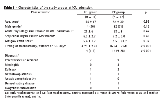 During the study period, 463 patients were admitted to the ICU of the facility. Of those, 28 underwent MV due to neurological disease and presented with a GCS score < 8 within the first 48 h of hospitalization. Of those 28, 11 were in the ET group and 17 were in the LT group. As can be seen in Table 1, the two groups presented similar characteristics in terms of demographic data (age and gender), severity (APACHE II and SOFA scores), coma severity (GCS score) and neurological diagnosis.