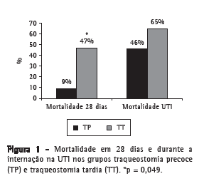 Posteriormente, ao longo da internação, a PAVM ocorreu em proporções elevadas nos grupos TP e TT (54% vs. 70%), sendo esses dados consistentes com a literatura, que aponta para um risco cumulativamente elevado em pacientes que permanecem na VM, sobretudo com rebaixamento do nível de consciência, e espelham a realidade de nossa UTI, que apresenta elevada taxa de infecção nosocomial.(15-18) A traqueostomia pode ter contribuído para a retirada mais precoce da VM, dado sugerido pelo maior número de dias fora da VM dentro dos primeiros 28 dias de internação. Acreditamos que a possibilidade de retirada mais precoce da VM, reduzindo a exposição do paciente aos seus riscos, sobretudo o de PAVM, seja o principal fator responsável pela maior sobrevida entre os pacientes traqueostomizados precocemente.