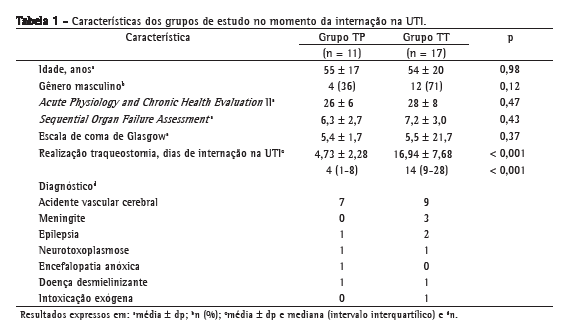Durante o período de estudo, foram internados na UTI deste hospital 463 pacientes, dos quais 28 tiveram a VM instituída em função de doença neurológica e se mantiveram com escore da ECG menor que oito nas primeiras 48 h. Dos 28 pacientes, 11 foram submetidos à traqueostomia dentro dos primeiros 8 dias de VM (TP) e 17, após este período (TT). Os dois grupos apresentavam características semelhantes em relação aos dados demográficos (idade e sexo), à gravidade (APACHE II e SOFA), à gravidade do coma (ECG) e aos diagnósticos neurológicos, conforme representado na Tabela 1.