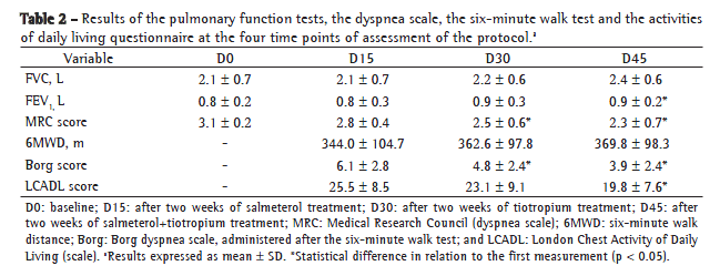 At the second visit (D15), the spirometric measurements were taken again and the degree of dyspnea was reassessed. Patients who scored between 3 and 4 on the MRC dyspnea questionnaire and had a post-bronchodilator FEV1 < 50% of predicted were maintained in the protocol, since the objective of the study was to evaluate patients who continued to experience dyspnea on minimal exertion despite the use of a long-acting β2 agonist. Those who showed improvement in functional class or a decrease in the degree of dyspnea between D0 and D15 were excluded from the study, as were those who had an exacerbation or who did not adhere to the prescribed treatment in those first two weeks.